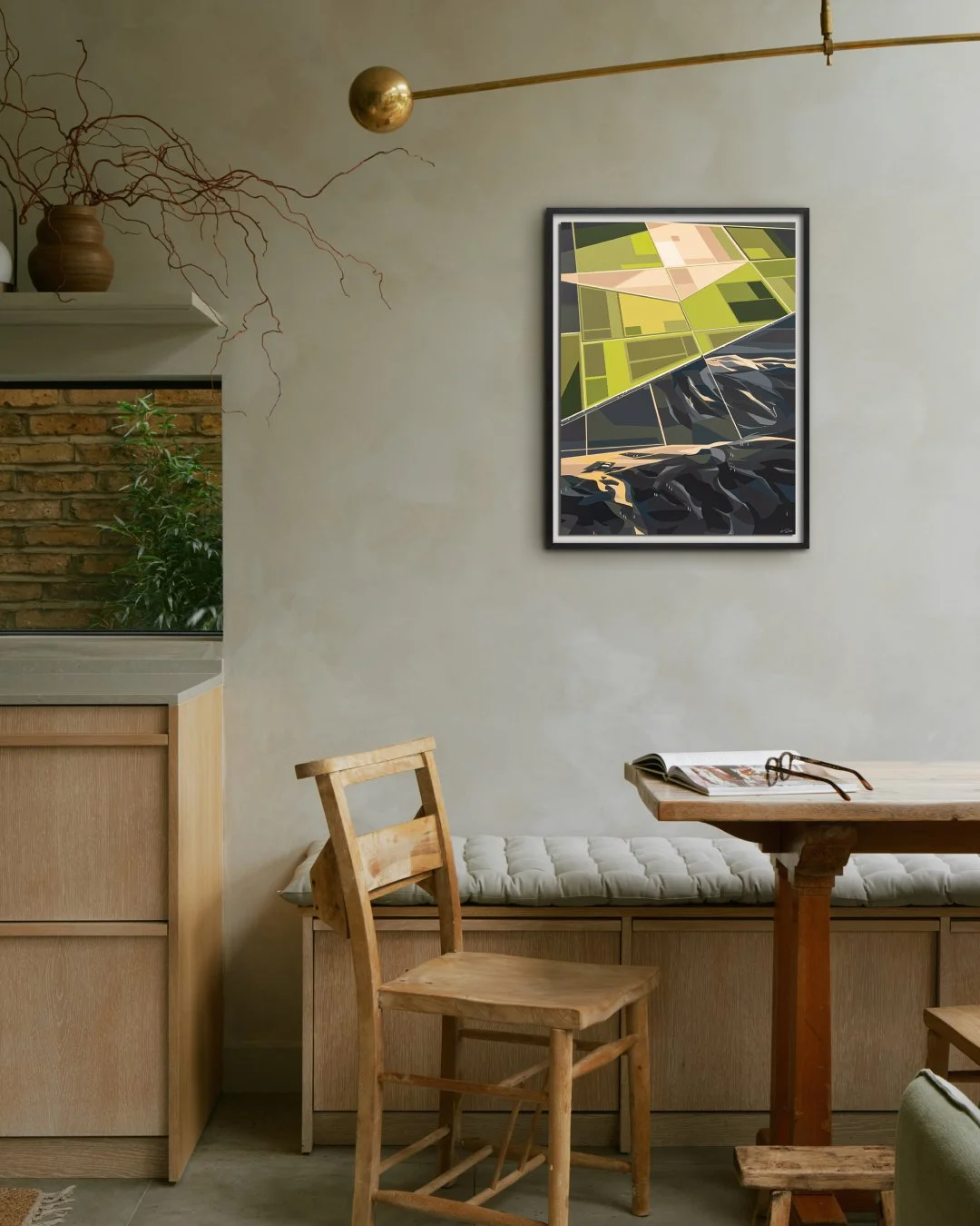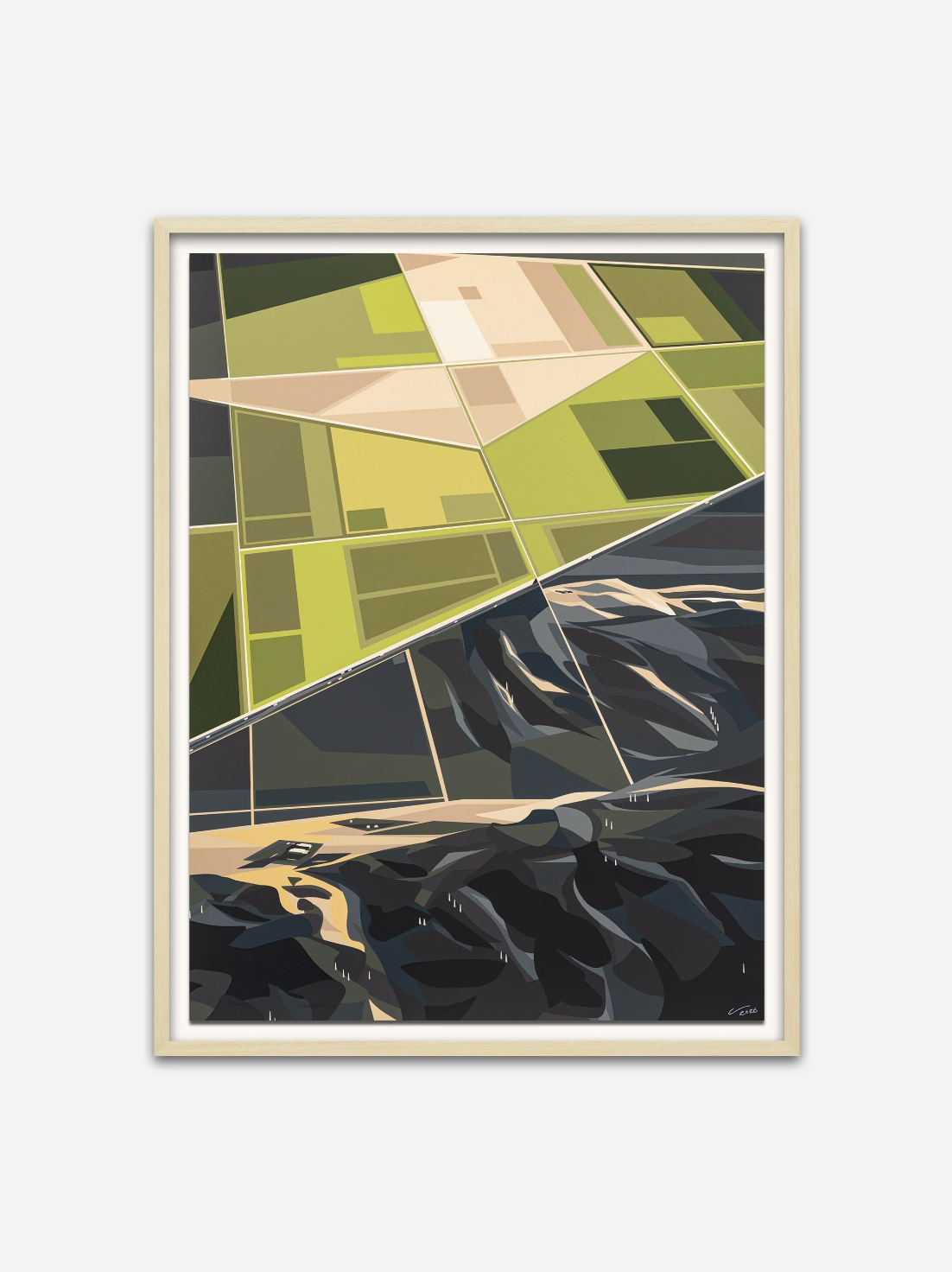 High Fly Over the Valley marks a pivotal moment in the artist’s practice, translating his sought-after digital landscapes into a meticulously crafted analogue print. Rooted in visual traditions that predate the digital age, the work draws inspiration from 1920s Precisionist painters who reduced American landscapes to geometric form and negative space. Grant describes his own approach as ‘Neo-Precisionism’. Working from photographs, he distils landscapes into powerful hard-edged compositions, using a limited colour palette that invites viewers to fill in the gaps with their own memories.